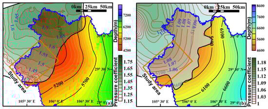 The superimposed map of buried depth and pressure coefficient of the Longwangmiao Formation (a) and Dengying Formation (b).