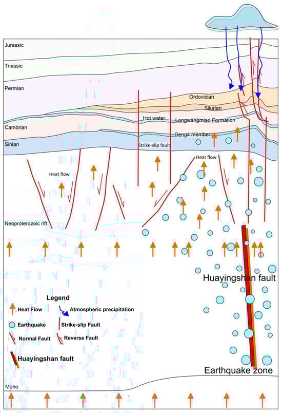 After a comprehensive analysis of the crustal structure, thermal reservoirs, heat flow, heat sources, occurrences of geothermal resources, as well as the focal points and advantages of thermal reservoir exploration, a deep geothermal heat accumulation model has been established (Figure 5). The research area is located in a region where the Moho surface is uplifted, marked by frequent seismic activity and the accumulation of geostress, indicating favourable heat source conditions [65]. The characteristics of thermal reservoirs within the area have been significantly influenced by various karst processes, resulting in the formation of high-quality thermal reservoirs within the Longwangmiao and Dengying Formations [35]. Regarding the caprocks, the overlying Dengying Formation above the Qiongzhusi Formation consists of a sedimentary sequence primarily composed of mudstone with a thickness of approximately 200 m. In a similar vein, the layer overlying the Longwangmiao Formation is made up of muddy dolomite, about 150 m thick, providing favourable conditions for an effective cap rock. In terms of pathways, the area under investigation features an intricate network of basement faults, such as the pre-Sinian faults and strike-slip faults in the basement identified by prior research. These faults may serve as channels to aid in thermal conductivity. Additionally, various surface faults present in the area, together with permeable cracks or multi-stage faults, both surface and subsurface, act as crucial conduits for groundwater movement. These geological structures support the supply of geothermal water to the geothermal resources in the Cambrian Longwangmiao Formation. The permeable catchment area at lower structural levels has proven to be an advantageous site for harnessing geothermal resources in the Longwangmiao Formation. Meanwhile, the underlying Sinian Dengying Formation has developed into a system with minimal or no free water, characterised as an anhydrous or oligohydrous carbonate geothermal system.