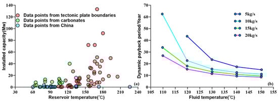 (a) A scatter plot depicting the correlation between reservoir temperature and installed capacity. (b) A graph showing the relationship between the dynamic investment payback period and the temperature of geothermal fluid.