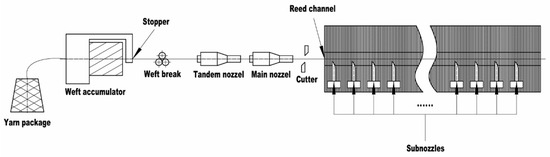 The air consumption of auxiliary nozzles accounts for 80% of the total air consumption, directly related to the energy consumption of air compressors, which constitutes 70% of the loom’s total energy use [5]. In-depth studies on the air consumption characteristics of auxiliary nozzles are rare, which limits the ability to accurately predict the total air consumption of the loom. Consequently, traditional modeling approaches struggle to comprehensively analyze the energy consumption of air-jet looms, making significant reductions in air consumption challenging.