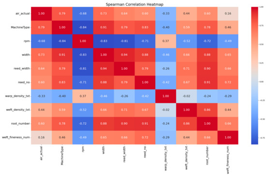 Here, represents the Spearman correlation coefficient, is the difference in ranks for the -th pair of observations (i.e., the square of the rank difference for each pair of observations), and is the number of observations. Subsequently, specific feature fields were selected from the raw data of the air-jet loom for analysis, and the Spearman correlation coefficient matrix was plotted, as shown in Figure 3. By comparing the correlation coefficients of different features with air consumption, suitable features were selected.