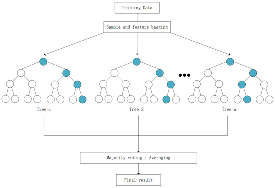 Random forest integrates multiple decision trees and employs Bagging and feature randomness strategies to effectively reduce overfitting, enhancing model accuracy and stability. It performs better than single decision trees or other algorithms in handling high-dimensional data, nonlinear relationships, and imbalanced datasets. Additionally, it has strong noise resistance and features important evaluation capabilities. The algorithm can leverage multi-core processors for parallel computing, which leads to faster training speeds. However, random forest models can be complex and difficult to interpret, requiring substantial memory to store the trees. The algorithm’s structure is illustrated in Figure 4.