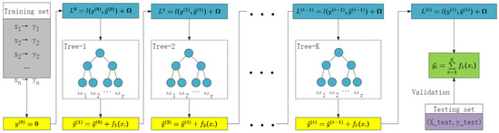 The objective of XGBoost is to minimize a given loss function , as shown in Equations (2) and (3). Here, represents the predicted value of sample , denotes the -th tree, and is the total number of trees.