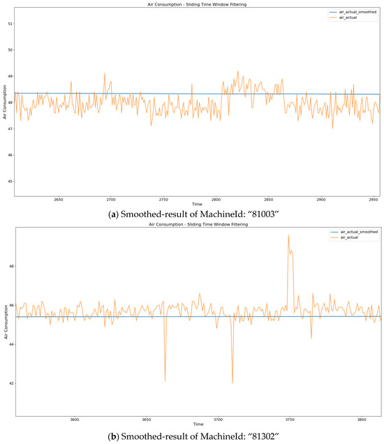 First, the raw data need to be cleaned using a sliding window filter. Figure 8 shows the cleaned data results for two of the machines. The sliding window filter effectively handles both sudden and sustained oscillations, demonstrating its robustness.