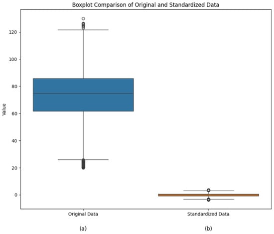 After data cleaning, the distribution of all gas consumption values is shown in Figure 9a. Additionally, standardizing the data is essential when training the model, as these algorithms are sensitive to the scale of the input data. Therefore, this study uses StandardScaler for data normalization, as shown in Figure 9b. The data transformation process is described in Equation (11), where is the original feature value, is the mean of the feature, is the standard deviation, and is the normalized feature value. This standardization centers the data around zero mean and unit variance.