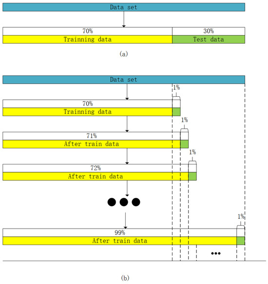 In the code, the amount of training data is gradually increased through iterations, starting from 70% and adding 1% with each iteration until reaching 100%, as shown in Figure 10a. In an incremental learning scenario, the model continuously learns and improves as more data arrives. To validate this approach, it is compared with a non-iterative method, as shown in Figure 10b. The code calculates the predictive performance, R2 and MSE, for both iterative and non-iterative models, as presented in Table 3. By continuously monitoring these metrics, it is possible to detect when the model starts overfitting or its performance declines, triggering parameter adjustments. This approach ensures that the model adapts promptly to changes in the dataset rather than remaining fixed in a specific training phase.