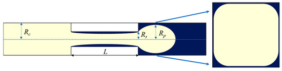 Based on Roof’s mechanism, which supports that the capillary force Pc-neck of the throat is greater than Pc-front of the leading edge, Ransohoff et al. [8] proposed the static snap-off criterion of the square pore–throat system, and the core hypothesis is that the wetting phase is the main flow mode in the corner of the square throat system, as shown in Figure 1. Ignoring the effect of liquid film on the wall, the snap-off judgement criterion of the throat system of the constricted square can be expressed as the following: