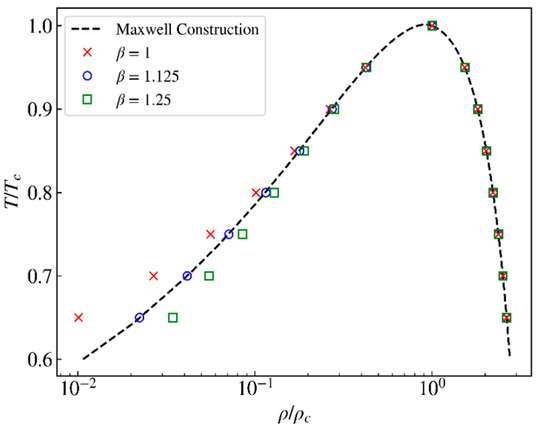 where W is the width of the phase interface, and is generally 2–5 grids. ρv and ρl are the gas and liquid densities of the Maxwell theory. In this method, the position of 50 ≤ y ≤150 is liquid phase and the other positions are gas phase. The gas–liquid interface is a straight line, and capillary pressure can be ignored [45]. We compare the gas–liquid coexistence density under β = 1, β = 1.125 and β = 1.25 and the Maxwell theory. As shown in Figure 2, when β = 1 (representing the original fluid-force format), it is observed that the gas–liquid density obtained from LBM simulation fails to match the gas–liquid density calculated directly using the RK EOS (solid line in Figure 2). However, by employing an improved fluid-force format and adjusting the coefficient β accordingly, we can achieve consistency between the gas–liquid density obtained from the LBM simulation and that derived from the RKEOS under specific temperature and pressure conditions. When β = 1.125, our LBM model basically shows agreement with the Maxwell theory, and β = 1.125 is therefore adopted.