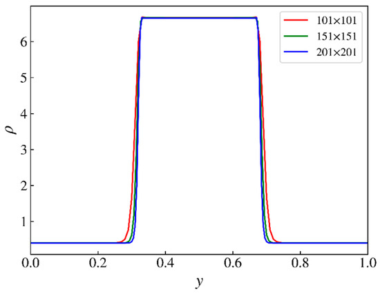 We calculate the interfacial tension by simulating the static circular droplet. Three different grid sizes (101 × 101, 151 × 151, 201 × 201) are constructed to simulate the density distribution of the static circular droplet and to test grid independence (this test is conducted to obtain a more accurate static interfacial tension.). The density initialization method proposed by Huang et al. [46] is adopted.