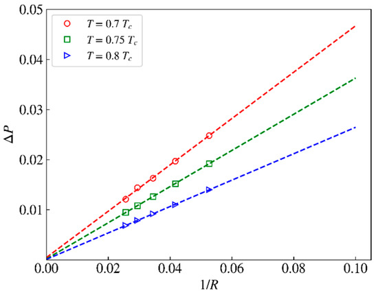 We further simulated the static behavior of the circular droplet at T = 0.7Tc, T = 0.75Tc and T = 0.8Tc. After the simulation reached equilibrium, the actual gas-hydraulic difference is calculated according to Equation (14). The interfacial tension is determined using the Young–Laplace equation, ∆P = Pint − Pout = σ/R [47]. In this study, the density of the gas–liquid interface is (ρv + ρl)/2, and the droplet diameter is determined based on this. By changing the droplet diameter, a series of pressure differences and its relationship with the droplet radius are obtained. As shown in Figure 4, the reciprocal of pressure and radius presents a good linear relationship (R2 is greater than 0.999). Through linear fitting, the tension values of the gas–liquid interface at different temperatures are 0.463, 0.361 and 0.264 lu, respectively (where lu stands for lattice unit).