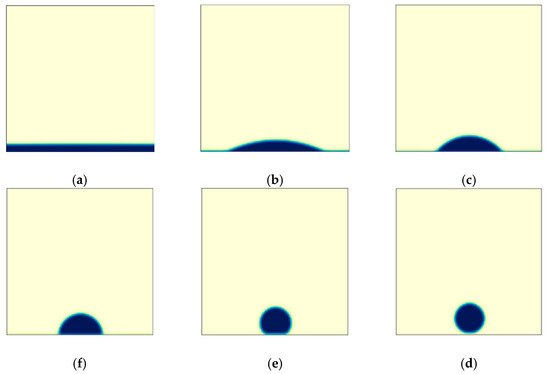 where R0 is the droplet initialization radius. In this paper, R0 = 15 lu, (x0, y0) = (75, 135) is set as the initial center of the droplet. The wetting angle can be simulated by varying the wall density ρw. The simulation results are shown in Figure 5.