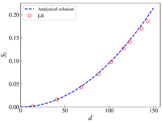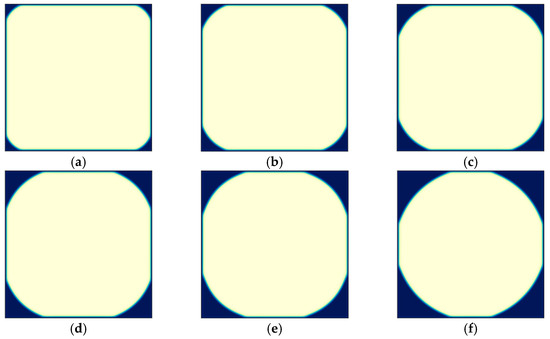 where (x0, y0) = (75, 75) is the coordinate position of the initial center of the bubble, and R1 is the initial bubble radius, which ranges from 75 to 75√2 to represent different radius of curvature of the corner liquid (0 to 75). As shown in Figure 6, our model can capture the curvature radius of the liquid film and liquid phase at the corner of the wall. The characterization method of static liquid film thickness on the wall can be found in reference [51,52,53]. This paper mainly focuses on the relationship between the curvature diameters and saturation of liquid phase at the corner.