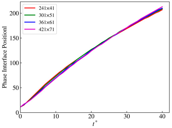 The grid independence test of the model is carried out through simulating the liquid phase displacement process in a single tube under different grid sizes (the vertex position of the curved liquid surface changed with time). To this end, four different grid sizes (241 × 41, 301 × 51, 361 × 61, 421 × 71) are established in this work. The bottom and top of the y-direction are used as solid boundaries with a non-slip rebound scheme. We set a 5 to 10 grid buffer area for the gas phase at the inlet and outlet; other places were set with the liquid phase. The external force flow at each node is added. We also applied a periodic boundary for the flow direction (x direction). When the liquid phase is displaced to the gas phase buffer area at the outlet, the liquid phase density is automatically replaced by the gas phase density at the next occurrence to realize the “disappearance” of the liquid phase in the buffer area, thus completing the displacement process. The simulation runs at T = 0.8Tc, ρv = 0.342 and ρl = 6.60 and the ratio of simulated displacement pressure and the ratio of simulated time step to the interval of sampling points remain constant, respectively. The simulation results are almost the same for different grid sizes in Figure 8. Therefore, the grid size of the simulation conditions is selected as 51 × 301 in the subsequent displacement simulations.