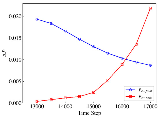We further calculate the changes in the Pc-neck and Pc-front values in the third stage, as shown in Figure 10. With the increase in time step, Pc-neck increases along with Srl; after the gas phase breaks through the throat, the curvature radius of the leading-edge increases, leading to the continuous reduction in Pc-front. Finally, Pc-neck > Pc-front causes the retained liquid phase to backflow and forms snap-off.
