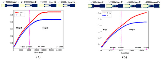 We increased the displacement pressure to ∆p = 0.078, as shown in Figure 11b; this shows the variation rule of Sg and Sg + Srl with time and the density distribution of two-phase fluid at a certain time of the three stages when Ca = 5.6 × 10−3. The first stage is consistent with the simulation results above. After the gas phase enters the throat, the liquid phase remains in the pore corner and the throat wall, the liquid thickness on the throat wall presents an uneven distribution, and Srl increases gradually. With the increase in the time step, the retained liquid phase flows back and snaps off the phase interface in the second stage, which indicates that the snap-off can occur before the gas phase breaks through the throat in the non-gradual pore–throat system.