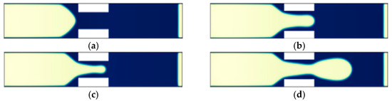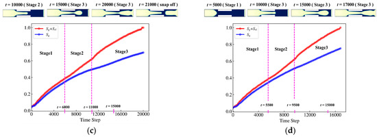 Keeping other conditions unchanged, we increased displacement pressure to ∆p = 0.105, as shown in Figure 11c. At this time, the capillary number (Ca = 8.0 × 10−3) is relatively large. Compared with the previous simulation results, the retained liquid phase saturation Srl on the throat wall in the second stage is small. With the time step increasing, the gas phase continues to flow forward and the snap-off does not occur until it breaks through the throat. When the gas phase reached the outlet, the retained liquid phase flows back and formed snap-off as the simulated time step continues to increase. In addition, the location of the snap-off moved to the outlet of the throat with the increase in capillary numbers, which shows agreement with the experimental results of Wei et al. [56], who used a 3D pore–throat structure to study bubble snap-off under different capillary numbers.