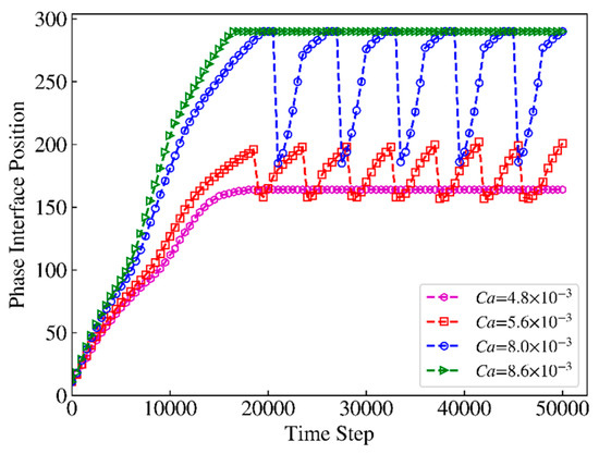 Figure 12 shows the changes in the leading-edge vertex positions of the phase interface over time under the above four conditions within 50,000 time-steps. After the occurrence of the snap-off, we took the peak of the curved liquid level in the throat as the actual phase interface position, so that when the phase interface position changed suddenly, it could be judged as the snap-off. We can see that when the gas phase is continuous, continuous snap-off can occur. The displacement and the location of the snap-off will hardly change each time, which is similar to the formation process of a droplet/bubble [57]. Meanwhile, for a specific pore–throat system, only when the capillary numbers meet a certain range will large capillary numbers inhibit the return of the retained liquid phase in the displacement and thus inhibit the occurrence of the snap-off, while small capillary numbers cannot overcome the capillary “pinning” effect to form effective displacement. Our simulation results are consistent with the conclusions obtained by Tsai et al. [9] in the study of bubble snap-off behavior under the pressure gradient at the gradual pore–throat.