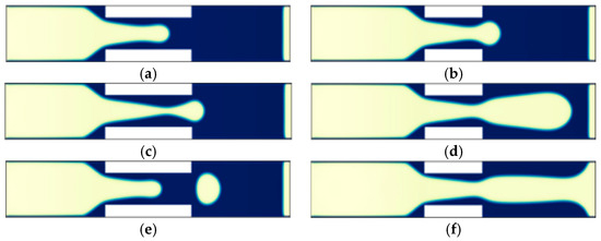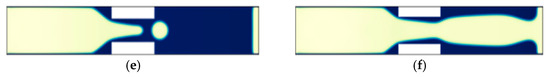 The displacement pressure is further increased to ∆p = 0.114 (Ca = 8.6 × 10−3), and the displacement pressure is large and Srl is small. As the time step increases, the gas phase breaks through the throat and eventually reaches the outlet. When the gas phase reaches the outlet, there is no snap-off with the increase in the simulated time step. It indicates that for a fixed pore–throat structure, there are critical capillary numbers. When the capillary numbers of the system are larger than the critical capillary numbers, the backflow of the retained liquid phase in the throat will be inhibited, so as to inhibit the occurrence of the snap-off.