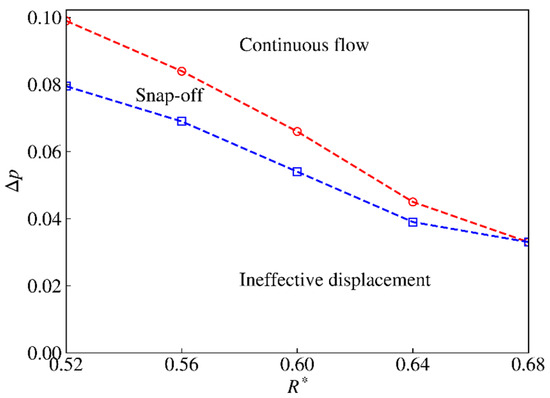 We also simulated the effect of the pore–throat width ratio on the snap-off and the critical displacement pressure was obtained, as shown in Figure 16. Similar to Section 3.3, for a pore–throat system with a fixed throat length, the gas–liquid two-phase produce three types of flow states under different displacement pressures. With the increase in throat width, the range of the displacement pressure decreases gradually. When the width ratio increases to R* = 0.68, the change in the displacement pressure will not cause the snap-off in gas–liquid two-phase displacement. It is important to mention here that for R* = 0.52, which meets the condition for predicting the occurrence of the snap-off according to the static criterion, when the displacement pressure is greater than 0.1, the snap-off will not occur, indicating that the snap-off can be inhibited by a large displacement pressure, even if the static criterion is met. Meanwhile, based on Equation (1), the critical width ratio is predicted to be (R* = 0.53), which is 28.3% lower than the critical width ratio through simulation (R* = 0.68).