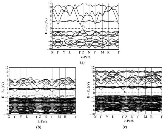 The band structure of NiO yields an indirect band gap with the conduction band (CB) minimum located at the Γ point, while the valence band (VB) maximum is located at the Z point as shown in Figure 2a. The bands are separated because of this hybridization, and the band minimum and maximum are no longer located at the same k-path in the first Brillouin zone. The band gap (EG) was calculated to be 3.04 eV, which is smaller than most of the experimental values in the range of 3.5 to 4.3 eV [56,57,58]. However, it aligns well with the recently re-investigated experimental data on optical absorption in NiO, which indicates that optical absorption starts at photon energies as low as 3.1 eV [55]. This result agrees well with the existing DFT+U based results and is significantly greater than the LDA/GGA values (0.5 to 1.0 eV) [49,67,68], thereby considerably improving the electronic properties of the HTL materials. All energies are relative to the Fermi Level (EF), depicted by the 0-eV reference point in Figure 2a. The k-path systematically samples various regions in the first Brillouin zone, connecting the high-symmetry points that exhibit a high degree of symmetry in the crystal system.