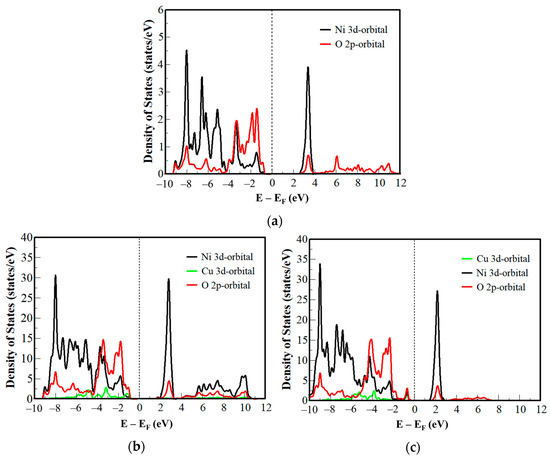 The p-type character of NiO was confirmed by the DOS, and Figure 3a shows that the Fermi level is closer to the valence band than to the conduction band. The Ni and O atoms bond with each other to produce the valence band [75]. Close to the Fermi level in the valence band, the 2p-orbital of O is dominant, while the 3d-orbital of Ni is dominant in the conduction band [76,77,78].
