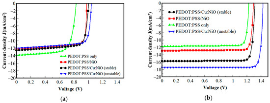 I–V characteristics of different composite HTLs with (a) a fullerene blend active layer and (b) a perovskite active layer.