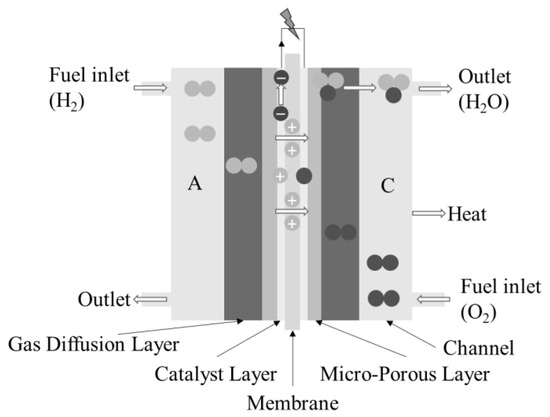 In low-temperature proton exchange membrane (LTPEM) fuel cells, hydrogen (H2) reacts with oxygen (O2) in air to produce water (H2O) and electricity with by-product heat. The basic structure and operation principle of the LTPEM fuel cells are illustrated in Figure 1.