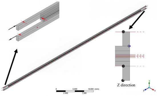 For the convenience of displaying the results below, figures have been reduced by ten times in the Z-direction (channel length). Moreover, Figure 4 is for demonstration purposes, indicating that this is a complete fuel cell result with both the anode and the cathode sides. As mentioned before, we have studied the anode side in a publication [21], so the figures in this work only focus on the cathode side for ease of display.
