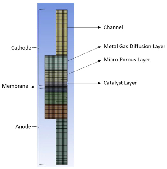 Figure 3 shows the computational mesh. The meshes are all coupled through appropriate boundary exchange terms and an iterative solution procedure. It was ensured that the number of layers in each domain is greater than five as in previous work, with a refined mesh at the domain interface, i.e., the interface between the channel and the GDL.