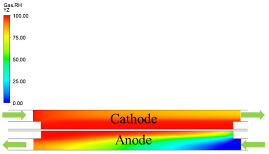 Obviously, due to the generation of water in the CL and its diffusion into the channel, the value of RH increases from the CL to the channel. Moreover, when the inlet RH is 100%, the distribution of RH is almost uniform (close to 100%), which matches the results of EES very well.