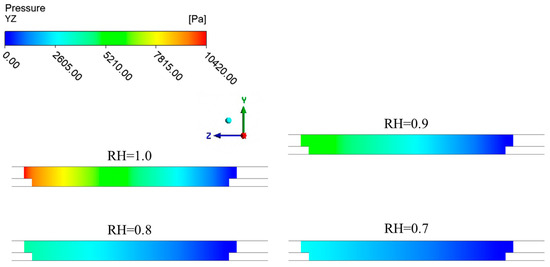 Relative pressure distribution in the middle of the channel (inlet RH = 1.0, 0.9, 0.8, and 0.7).