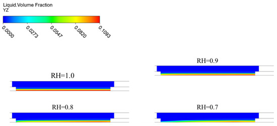 Liquid water volume fraction distribution in the middle of the channel (inlet RH = 1.0, 0.9, 0.8, and 0.7).