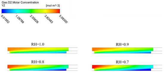 Figure 7 shows the oxygen molar concentration distribution, which decreases along the channel because of oxygen consumption by the electrochemical reaction. Moreover, it also decreases in the Y-direction from the channel to the CL due to oxygen sink term here. With the decrease of inlet RH, oxygen molar concentration at the inlet increases synchronously; that is, the component of inlet gases will be affected by the inlet RH. Note that, when the inlet RH is decreasing, there is a risk of oxygen molar concentration reducing to zero (near the outlet), which is highly dependent on the diffusivity of oxygen. When considering these figures, one must not disregard the decrease in the stoichiometric flow ratio from 3.755 in the first case to just 1.451 in the last case.