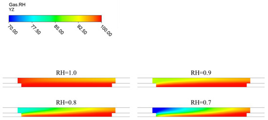 Relative humidity distribution in the middle of the channel (inlet RH = 1.0, 0.9, 0.8, and 0.7).