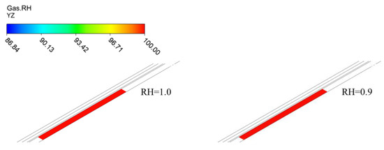 Figure 5 shows the relative pressure at YZ plane, X = 0.3 mm, and the outlet pressure is 1 atm as a boundary condition. As mentioned above, the general finding is that decreasing the inlet RH yields a lower pressure drop from the inlet to the outlet. This is mainly because decreasing inlet RH will cause a smaller inlet mass flow (see Equation (11)). On the other hand, the pressure exhibits an almost one-dimensional distribution in the XY plane; that is, the value changes slightly from the channel to the porous medium.