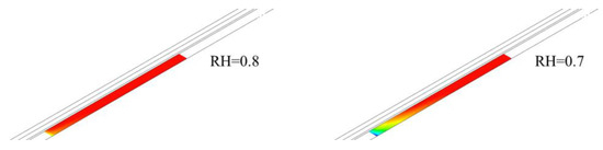 The RH in through-plane is shown in Figure 8. Basically, the RH increases along the channel from the inlet to the outlet due to the produced water, and the RH is lower than 100% at the outlet slightly because there is a small part of liquid water leaving the cell. This is different from the model by Bielefeld et al. [3], who assumed a perfectly mixed gas in their 1-D model. In this more refined CFD study, there is a boundary layer of water vapor predicted that leads to liquid water leaving the cell, similar to the work by Berning [16]. Although the decrease in pressure can lead to a decrease in RH, a significant increase in water molar fraction plays a dominant role here, which can be derived from the expression of RH (Equations (9) and (10)).