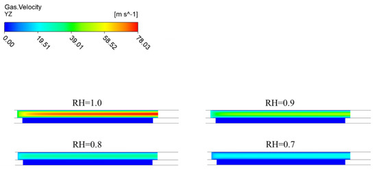 Velocity distribution through-plane (inlet RH = 1.0, 0.9, 0.8, and 0.7).