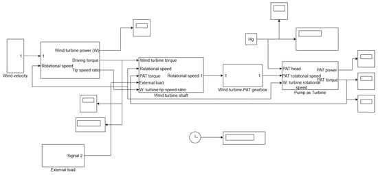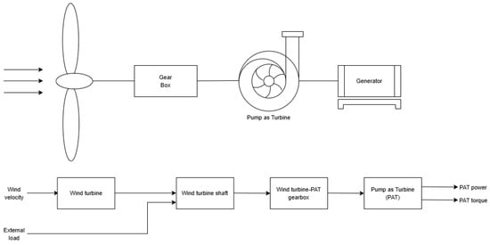 The wind power system dynamics was simulated using the MATLAB/Simulink software suite R2023b, which allowed the construction of a block diagram of the wind turbine connected to the PAT via a constant ratio gearbox as illustrated in Figure 1 and Figure 2. It is noteworthy that the electric generator model was intentionally omitted from the simulated power scheme for simplicity. Nevertheless, the power plant model incorporates a time-varying torque load to represent the electric generator’s demand on the wind turbine shaft. Due to its reversible operational mode, the Pump-As-Turbine (PAT) system was simulated both in hydraulic turbine mode and in centrifugal pump mode.