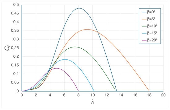 where e are the minimum and maximum blade radius values, respectively. Using Equation (2), the power coefficient [], , of the wind turbine can be determined in the following manner: