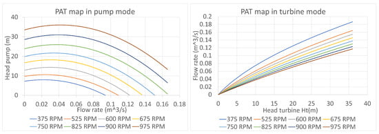 The operational maps of the reversible hydraulic machine (modeled in Matlab-Simulink) are presented in Figure 4 for the pump and the turbine mode, respectively. The four examined PAT families are listed in Table 1.