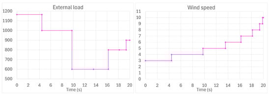 From Figure 9, Figure 10, Figure 11 and Figure 12, it can be noted that PAT Family 2 is completely dominated, while a significant number of non-dominated solutions belongs to Family 3 (yellow dots). In other words, considering the reference wind speed and external load time history (Figure 5), the most performing PAT family is the third one. These results suggest focusing further investigation only on Family 3 elements; specifically, the additional analysis aimed to evaluate the PAT performances as the wind speed and external load profiles assume the trends shown in Figure 6, Figure 7 and Figure 8.
