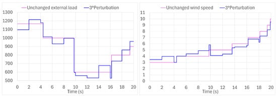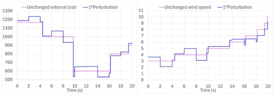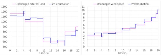 However, applying dominance checks (Equation (4)) only to DoE points within the design variable space provides an initial estimate of the Pareto frontier. To achieve a more accurate representation of the Pareto front, a multi-objective optimisation approach is required. This process is focused on finding, within the design variable domain, the directions that lead to improvements in performance variables based on the specific optimisation problem, as in the methodology proposed by Dambrosio et al. []. Nevertheless, since wind speed and external electric load are inherently random (stochastic), the optimisation results should account for various temporal patterns in both variables. Therefore, this investigation first considers fixed temporal patterns for both the stochastic variables (illustrated in Figure 5), as previously implemented by Dambrosio, but limited to four PATs []. Based on these reference profiles, random perturbations of with respect to the baseline value, characterised by a pseudo-random number with normal distribution, are added to simulate realistic operating conditions. It is important to emphasise that a single perturbation of the wind velocity and external load is not sufficient to adequately represent the complexity of the operating conditions. For this reason, three distinct variations for both variables are examined, appropriately compared with the initial reference cases. The temporal variations of reference wind speed and external load, along with their perturbed counterparts, are graphically illustrated in Figure 5, Figure 6, Figure 7 and Figure 8. The reference profiles are represented by purple lines, while the newly generated profiles are shown in blue.