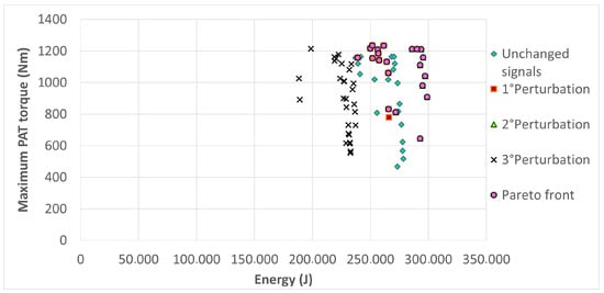 Then, the dominance studies were performed for each PAT and globally for the entire third family. For the sake of brevity, only the comparison between the best design solutions of the third PAT family obtained in the four study cases (reference profiles Figure 5 and perturbed profiles Figure 6, Figure 7 and Figure 8) was reported. Finally, following further dominance analysis, the new Pareto front obtained (pink dots) is reported in Figure 13, Figure 14, Figure 15 and Figure 16.
