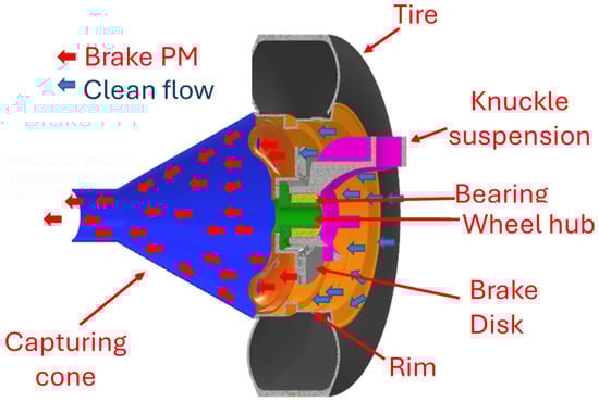 Figure 1 shows an example of a semi-closed sampling system []: during vehicle driving, the air impacting the vehicle is compressed in the underbody and forced to exit laterally towards the sides of the vehicle, generating an airflow from inside the wheel rims outward, which cools the brakes. To preserve the direction of the airflow and promote natural brake cooling, sampling is conducted outside the wheel rim using a conical collector that fully covers the rim to create a semi-closed sampling system. To ensure stable airflow conditions, the air flow of the system is controlled by a suction device at the end of the sampling line.