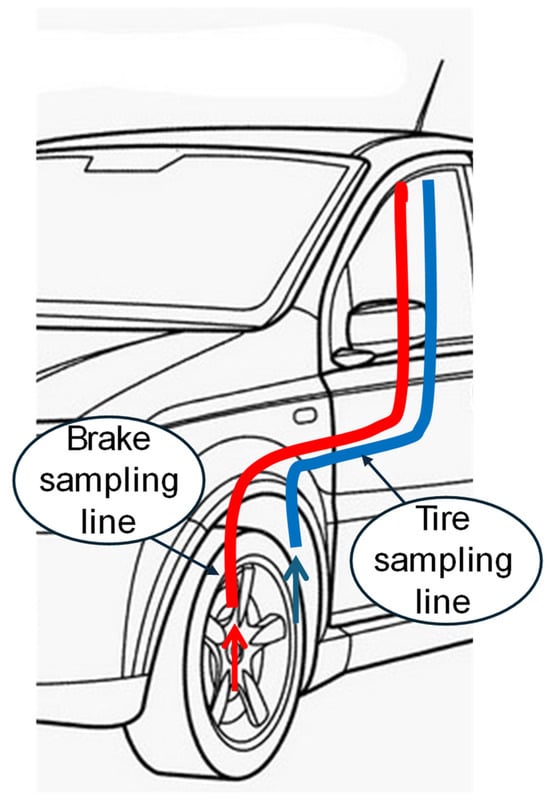 A typical open sampling system is shown in Figure 2 []. The system includes two sampling lines for the simultaneous measurement of particles from brakes and tires. Sampling is performed at the front wheel because the weight of the vehicle shifts forward during braking; therefore, the front wheels are more stressed, and the friction is larger []. A third sampling line on the roof of the test vehicle is used for background particulate measurements. The brake sampling probe is positioned 5 cm from the center of the wheel, while the tire sampling inlet is installed 2.5 cm from the top of the wheel. The distance between these two probes is 30 cm. Isokinetic sampling probes were utilized.