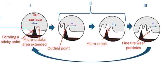 A study conducted by Yan et al. [] suggests that the formation of tire particles occurs through three repeating processes. The first is the wear of the tread tips, which generates micrometric particles; the second is the formation of small cracks following the high vibration frequency; and the third is linked to the widening of these cracks, which wear away, generating coarse material (Figure 3).