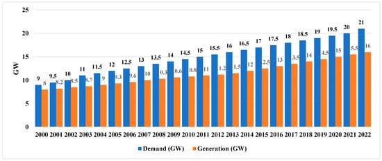 In recent years, global energy demand has surged due to population growth and rapid industrial advancement. As a result, renewable energy sources have gained widespread adoption in both the industrial and residential sectors [1]. Solar energy, being unlimited, eco-friendly, and secure, is a highly sought-after form of green energy [2]. Global photovoltaic (PV) capacity has dramatically increased over the past twenty years, from 1288 MW in 2000 to 1,177,000 MW in 2022, reflecting a significant rise in solar energy use [3]. Pakistan receives abundant solar irradiance, averaging 2400 kWh/m2 annually and 5–7 kWh/m2 daily, with over 2300–2700 sunshine hours and more than 300 sunny days per year. Leveraging this resource could significantly address the country’s energy shortfall [4]. Pakistan’s energy sector faces severe power shortages, about 2.5 outages daily, lasting 13.2 h each. Over 75% of businesses cite unreliable electricity as a major obstacle, primarily due to technical malfunctions [5]. Load shedding severely affects Pakistan’s industrial sector, reducing its GDP by 2–3% annually, or USD 7.5 to USD 11.25 billion. The textile industry, responsible for 60% of exports, loses about USD 1.3 billion yearly due to power shortages, decreasing manufacturing output by 15–20%. Industries spend over USD 1 billion annually on diesel for generators, with backup systems costing USD 5000 to USD 100,000 each. Small and Medium Enterprises (SMEs) face revenue declines of 20–30%, with 10–15% closing or downsizing. Load shedding also results in the loss of over 400,000 jobs each year and deters USD 1–2 billion in foreign investment, highlighting the urgent need for reliable energy solutions to support economic stability [6]. Figure 1 shows the electricity demand and generation of Pakistan.