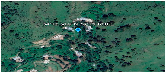 The chosen location, “Berru Bandi”, is a small community of 10 houses in the rural area of Abbottabad District, around 25 km from Abbottabad city, Pakistan. Positioned on a mountain at coordinates 34°16′38″ N 73°15′18″ E and at an elevation of 1456.79 m above sea level, accessing this site is difficult due to the absence of road infrastructure and basic amenities. Figure 3 shows an overview of the selected site from Google Maps.