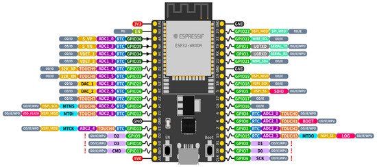 The ESP-32, developed by Espressif Systems, is a versatile, low-cost System-On-Chip (SOC) microcontroller known for its integrated Wi-Fi and dual-mode Bluetooth capabilities. Launched in 2016 as a successor to the ESP8266, it features a dual-core Tensilica Xtensa LX6 microprocessor (Cadence Design Systems, San Jose, CA, USA), clock speeds up to 240 MHz, and advanced power management with various sleep modes, making it ideal for energy-efficient IoT applications. Figure 6 shows a pinout of the ESP-32, and Table 4 shows the technical details of the ESP-32.