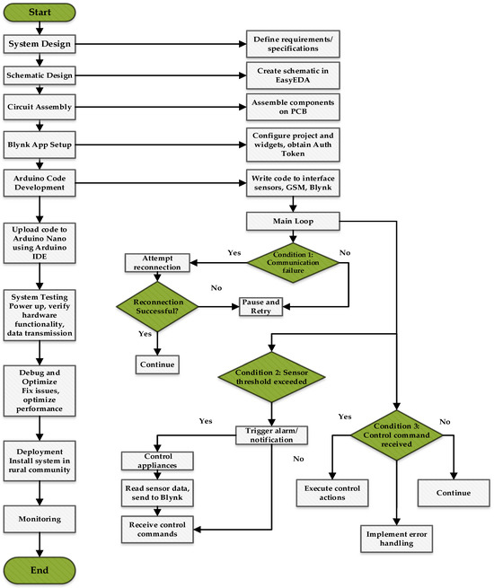 The process starts by creating a circuit diagram using EasyEDA software, incorporating components like the Arduino Nano, GSM SIM800L, ESP-32, current and voltage sensors, a relay, buck converters, and an LCD. The components are then soldered onto the PCB. Next, the Blynk app, an open-source SCADA design system, is configured. The Arduino code is developed to manage the SCADA system parameters, uploaded via Arduino IDE 1.8.19, and verified using a serial monitor. Hardware testing follows to enable live data monitoring from FIDs and the control of electrical loads using the IoT Blynk app and Blynk console web dashboard. Figure 7 shows a flow chart of the system process.